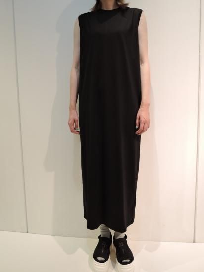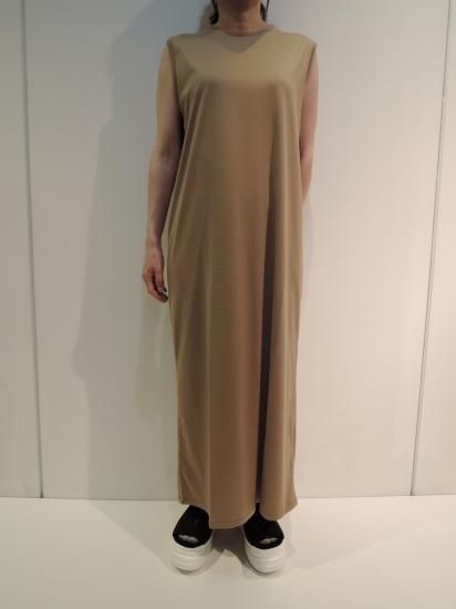 ノースリーブトップスをそのままストレートに伸ばしたマキシ丈のワンピースドレス。