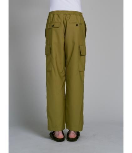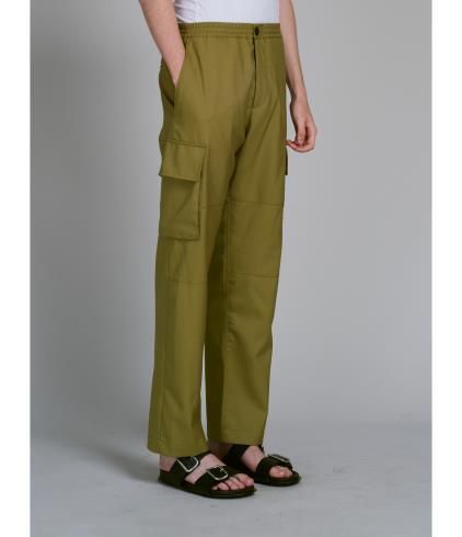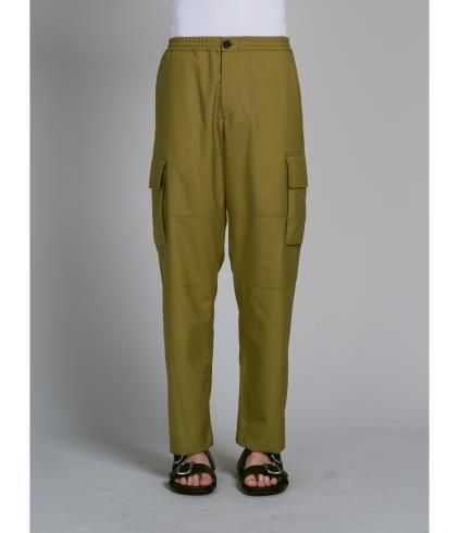 トロピカルウール製のカーゴパンツ。レギュラーフィット、ドローストリング付き 伸縮性のあるウエスト。ホーンボタンとジップフライによる開閉。サイドにユーティリティポケット、スラントポケット、バックにボタン付きコントラストポケット。レッグにライニング。