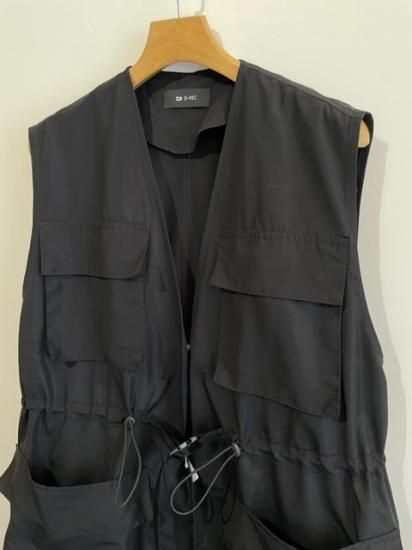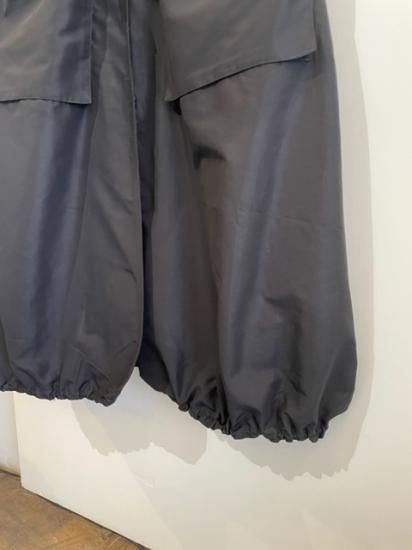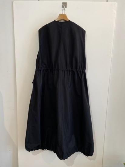 リサイクルポリエステルで織られた張り感のあるタッサー素材を採用したノースリーブのロングジャケット。耐久撥水加工。