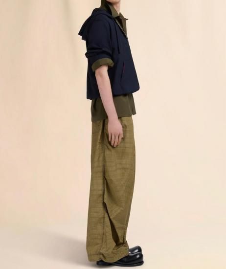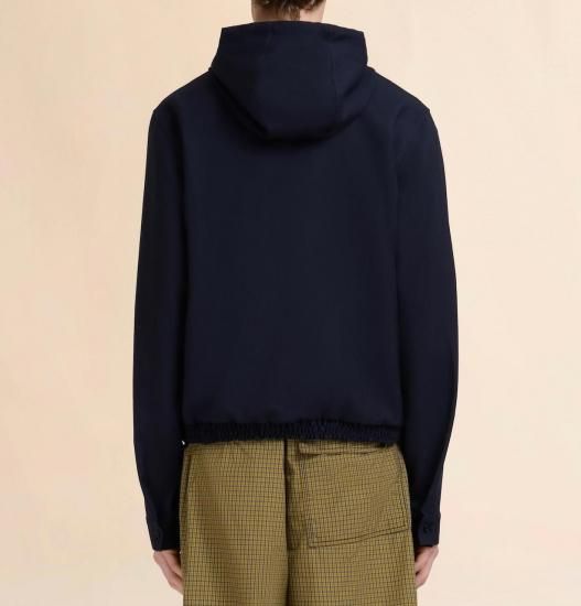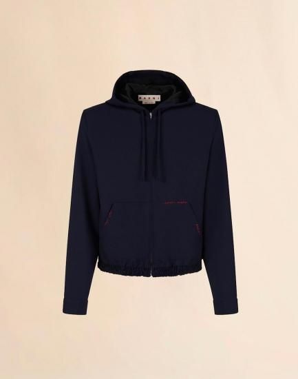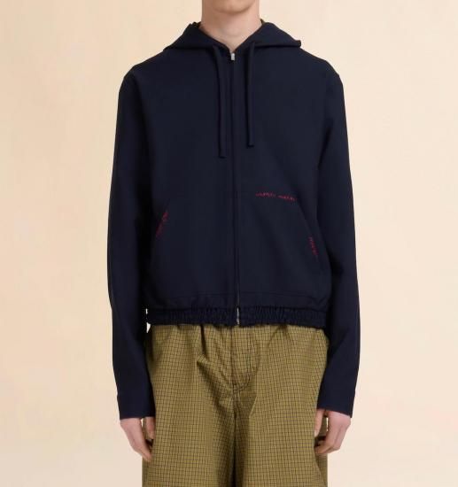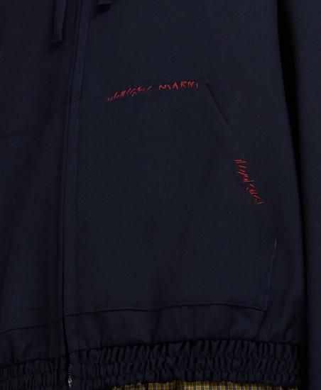 カンガルーポケットにコントラストカラーの糸で手刺繍によるマルニメンディングステッチとロゴ。
