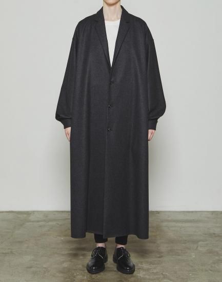 2/54カレッジフランネルを使用したシャツコートです。トラディショナルな印象をもつノッチドラペルのコートにシャツのディテールを取り入れることで現代的にアップデートしています。首元から胸元に添って入る深めのVゾーンのシングルフロントがより洗練された印象を付与しています。釦はオリジナルの水牛ボタンを使用。ダイナミックなバスト寸と蹴回しで、ロングシャツのように軽やかに広がるAシルエットを演出しいます。またシームポケット仕様にすることで、よりミニマルで洗練された仕上がりに。肩回りと袖はゆったりとした設計で、袖を少し長めにすることでカフスがブラウジングされ、袖口のタックにより更にボリュームを持たせています。