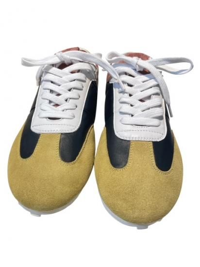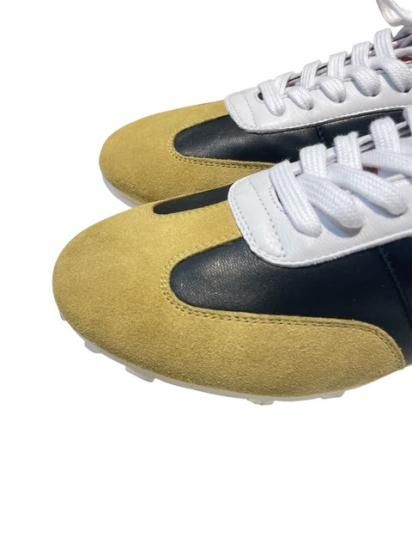 ナッパレザーとスエードのコントラストパネルで作られたロートップスニーカー。 レトロなフットボールスタイルにインスピレーションを受け、スリッパのような履き心地を実現。 柔軟なラバーアウトソールと、裏地のないデコントラクテなアッパー。 サイドにレッドのマルニロゴ、ロゴ入りアイレット付き。