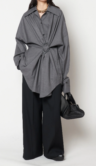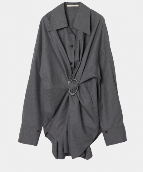 HARUNOBUMURATA 秋冬新作コレクションより、アイコニックなバックルをあしらったシャツ。不規則なドレープが美しさを際立たせます。